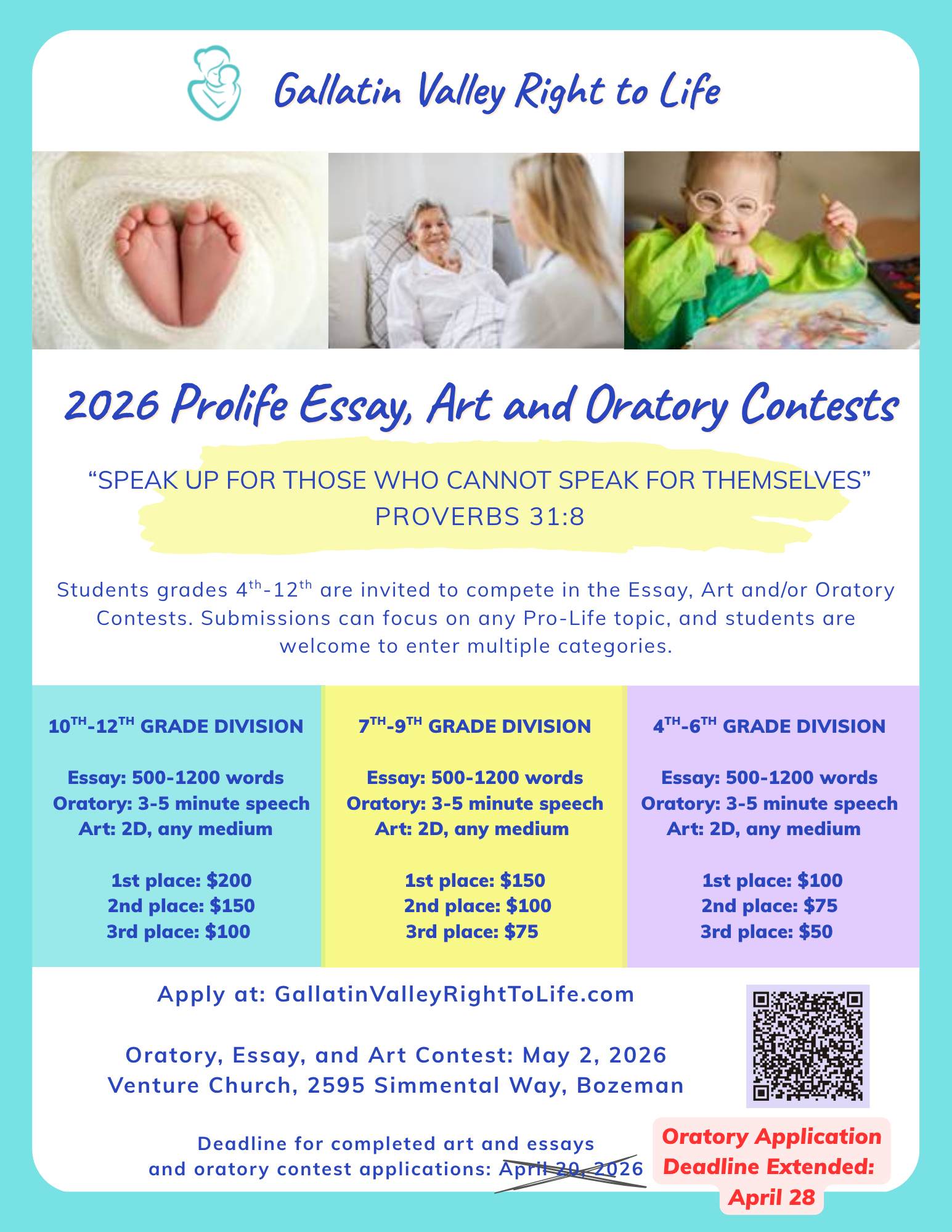4th -12th Grade Students: Win up to $600 in Gallatin Valley Right to Life’s annual Prolife Art, Essay, and Oratory Contests!